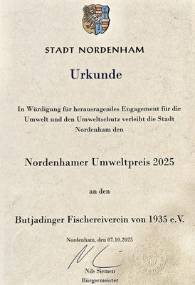 Am 7. Oktober 2025 wurde der Butjadinger Fischereiverein von 1935 e.V. im Rahmen einer feierlichen Veranstaltung im Nordenhamer Rathaus mit dem Nordenhamer Umweltpreis 2025 ausgezeichnet. Der